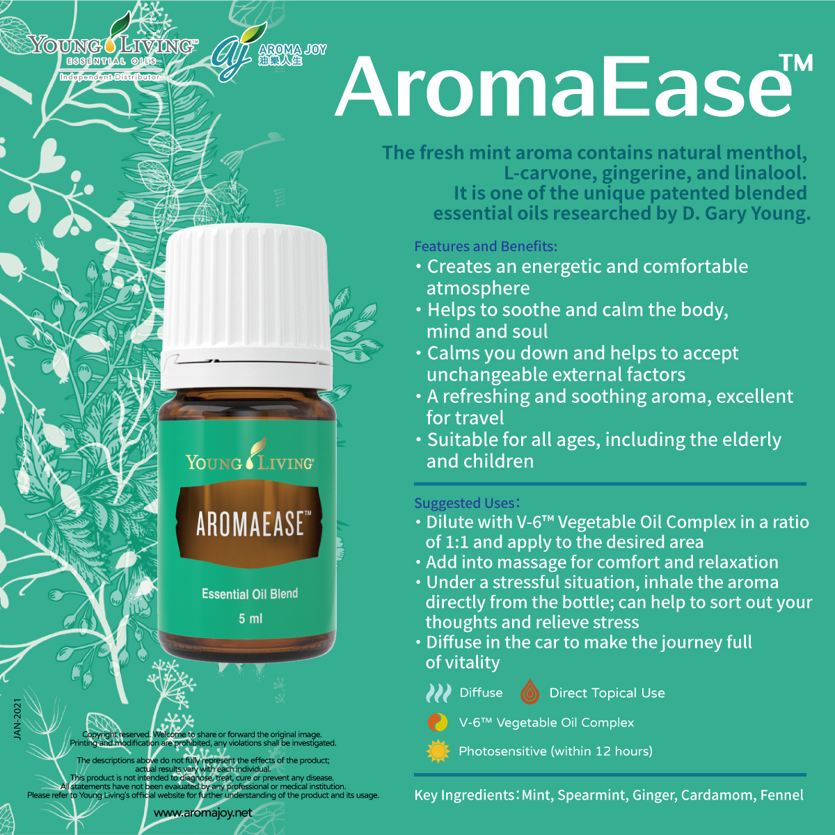 ✨ 舒緩放鬆 Relax & Calm:AromaEase 精油以薄荷清涼與草本能量,幫助緩解壓力與暈車不適 🚗💨。