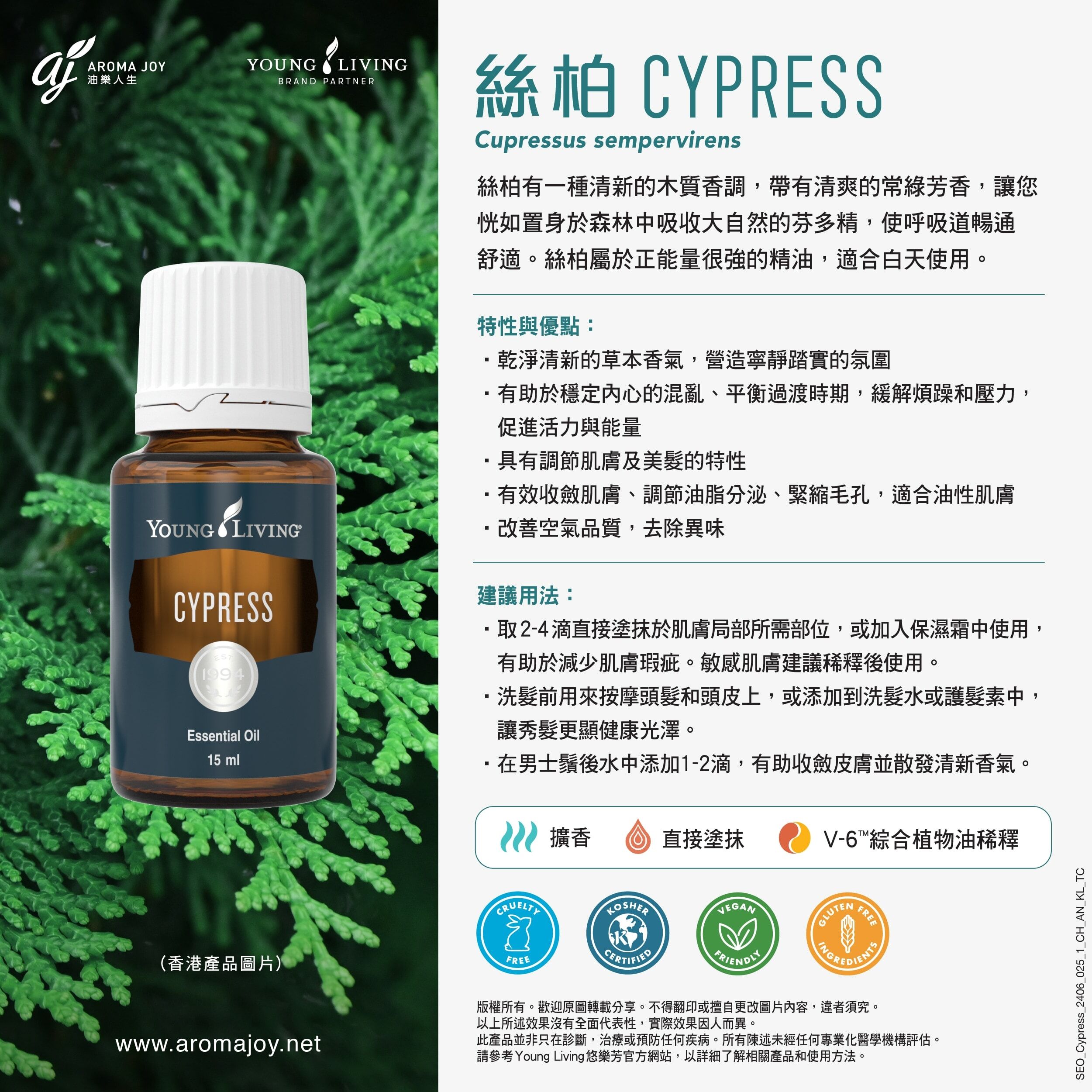 絲柏精油散發清新木質氣息 🌲,有助淨化空氣 💨、舒緩壓力 🧘♂️,同時提升專注力與穩定感 ⚖️。適合日常擴香或按摩,營造清新寧靜氛圍 ✨。