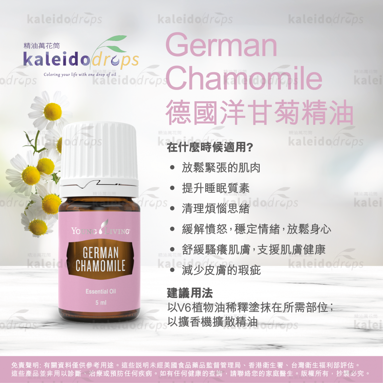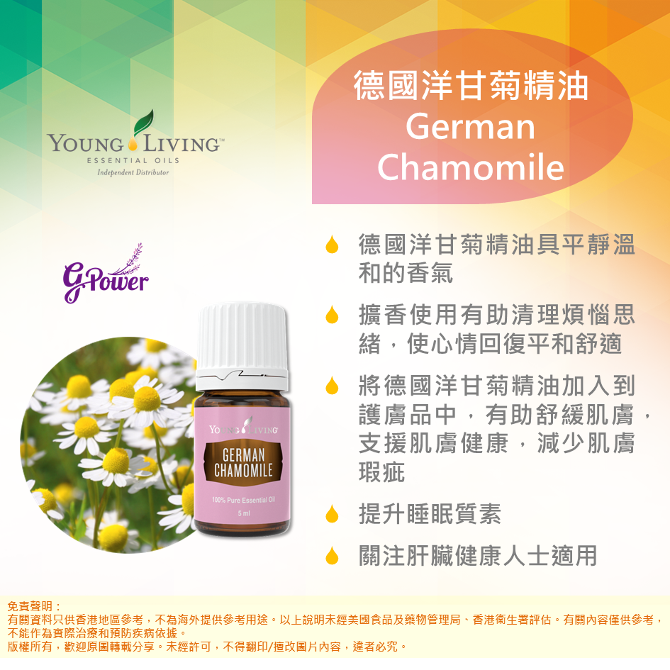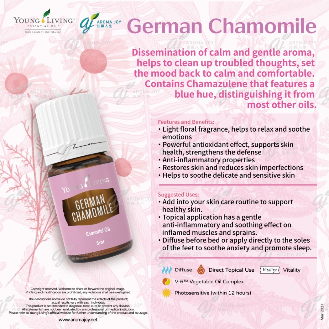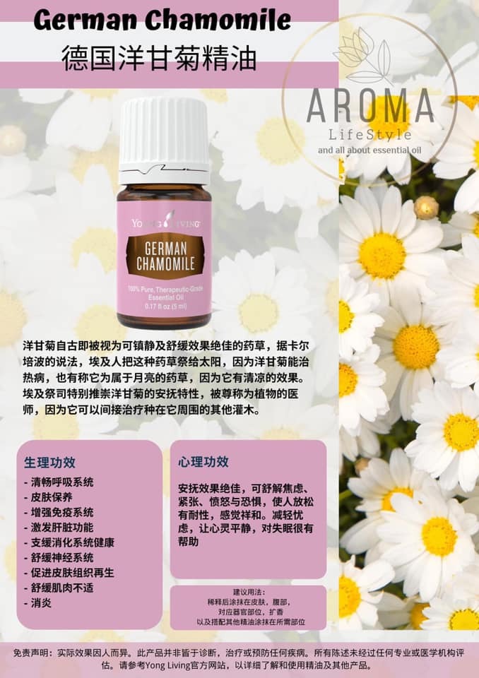 Young Living 德國洋甘菊精油 💙 以獨特藍色精華和溫和花香聞名,能深度放鬆心情、幫助安眠 🌙,並有效舒緩敏感肌膚。適合睡前擴香、按摩或芳療使用,帶來全方位的寧靜呵護。