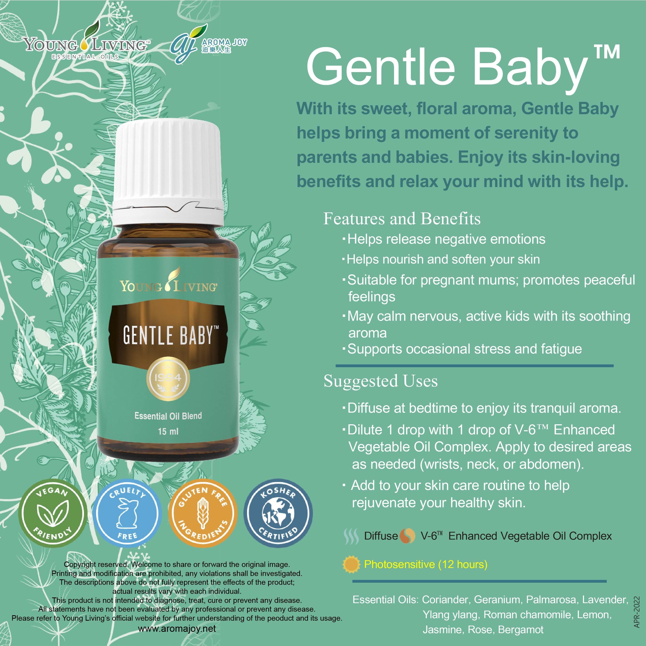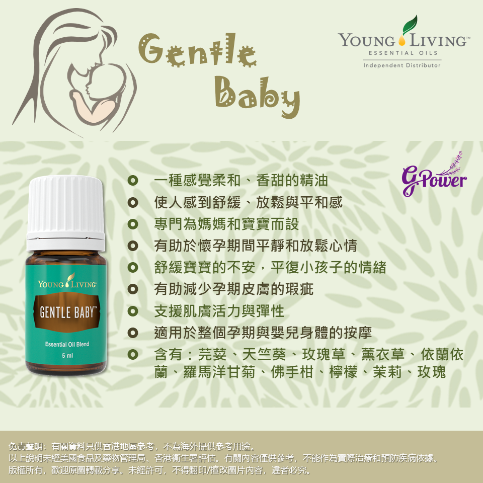 Gentle Baby™ 嬰兒溫和精油 👶🌸,專為媽媽與嬰兒設計,融合玫瑰草、玫瑰、天竺葵、依蘭依蘭等溫和植物精華 🌿💧,能舒緩情緒、柔嫩肌膚、營造安心氛圍 🛌💖。無論懷孕中、產後調養,抑或日常呵護寶寶,都能帶來全方位的天然守護 🌏✨。