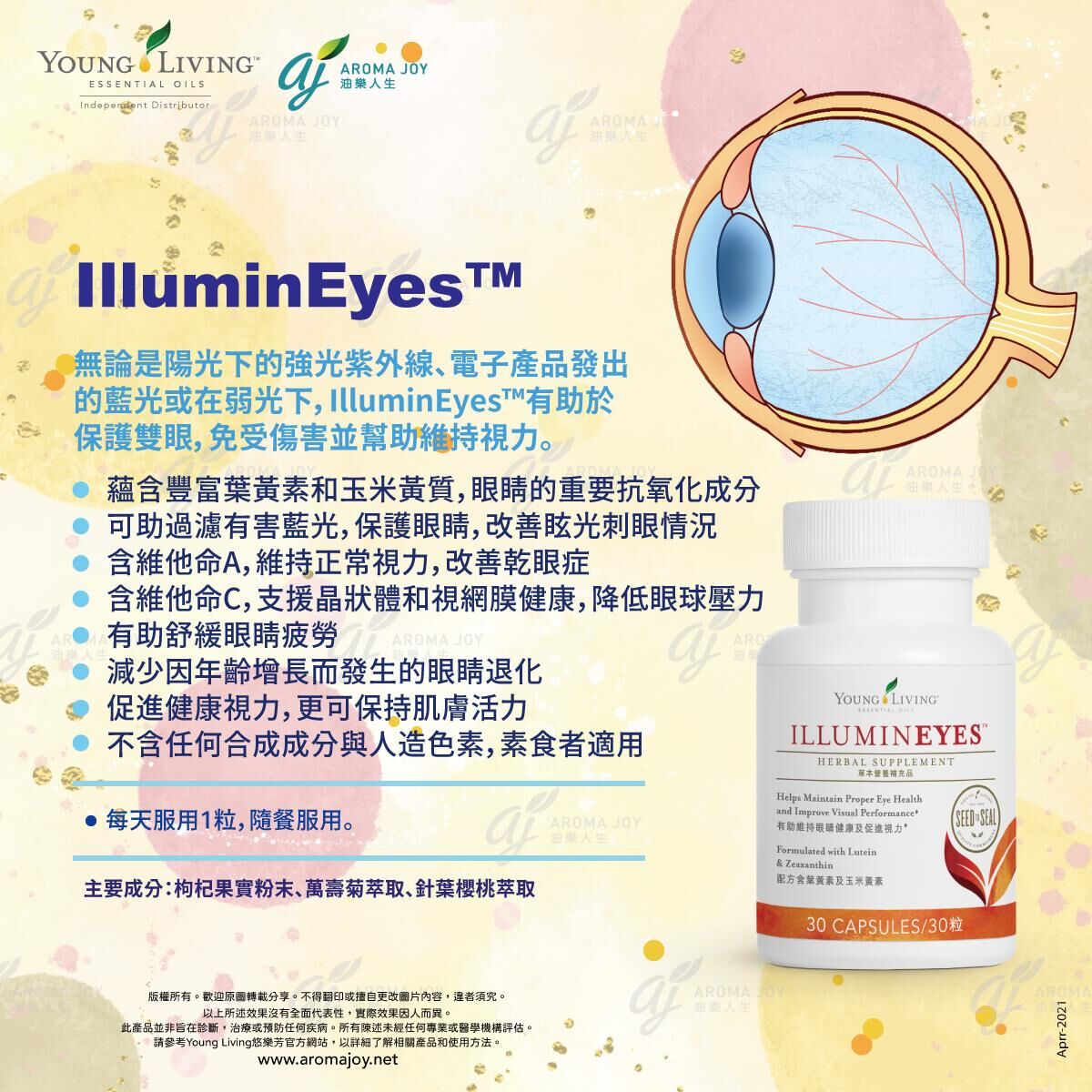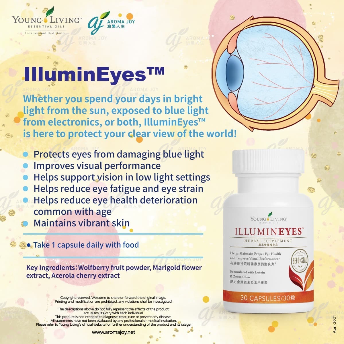 Young Living IlluminEyes™ 含有 葉黃素、玉米黃素、維他命 A、C、E,專為 視網膜健康、抗藍光 💻、長效護眼 而設。特別適合長時間使用電腦手機、希望保持雙眼清晰有神的人士。