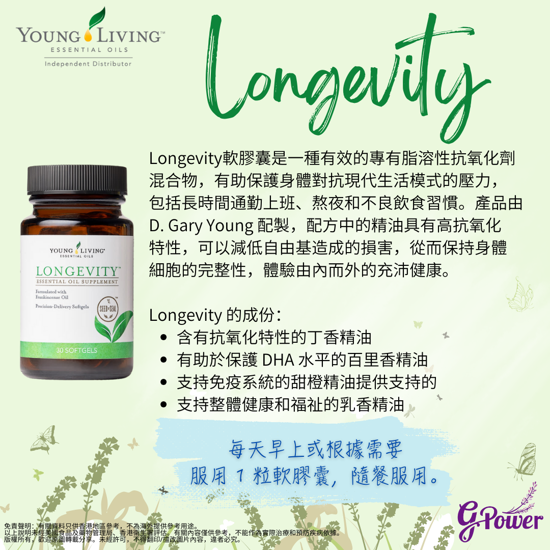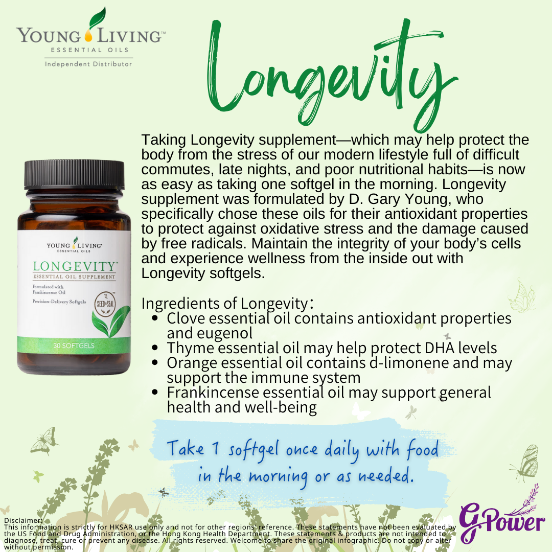 💚 每日年輕活力!Young Living Longevity™ 膠囊,融合百里香、甜橙、丁香、乳香等高抗氧化精油,有效對抗自由基,支持免疫系統,全面提升健康與能量。讓你由內而外保持青春光采 ✨🌿