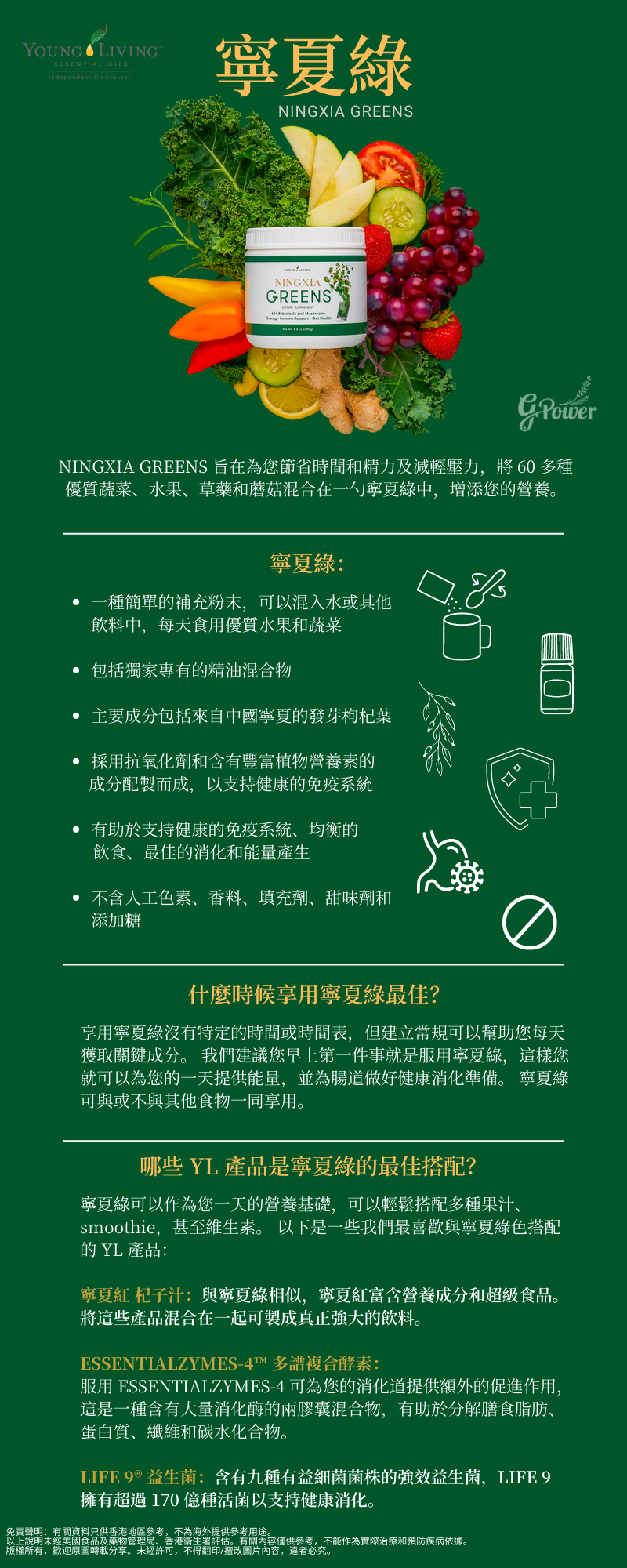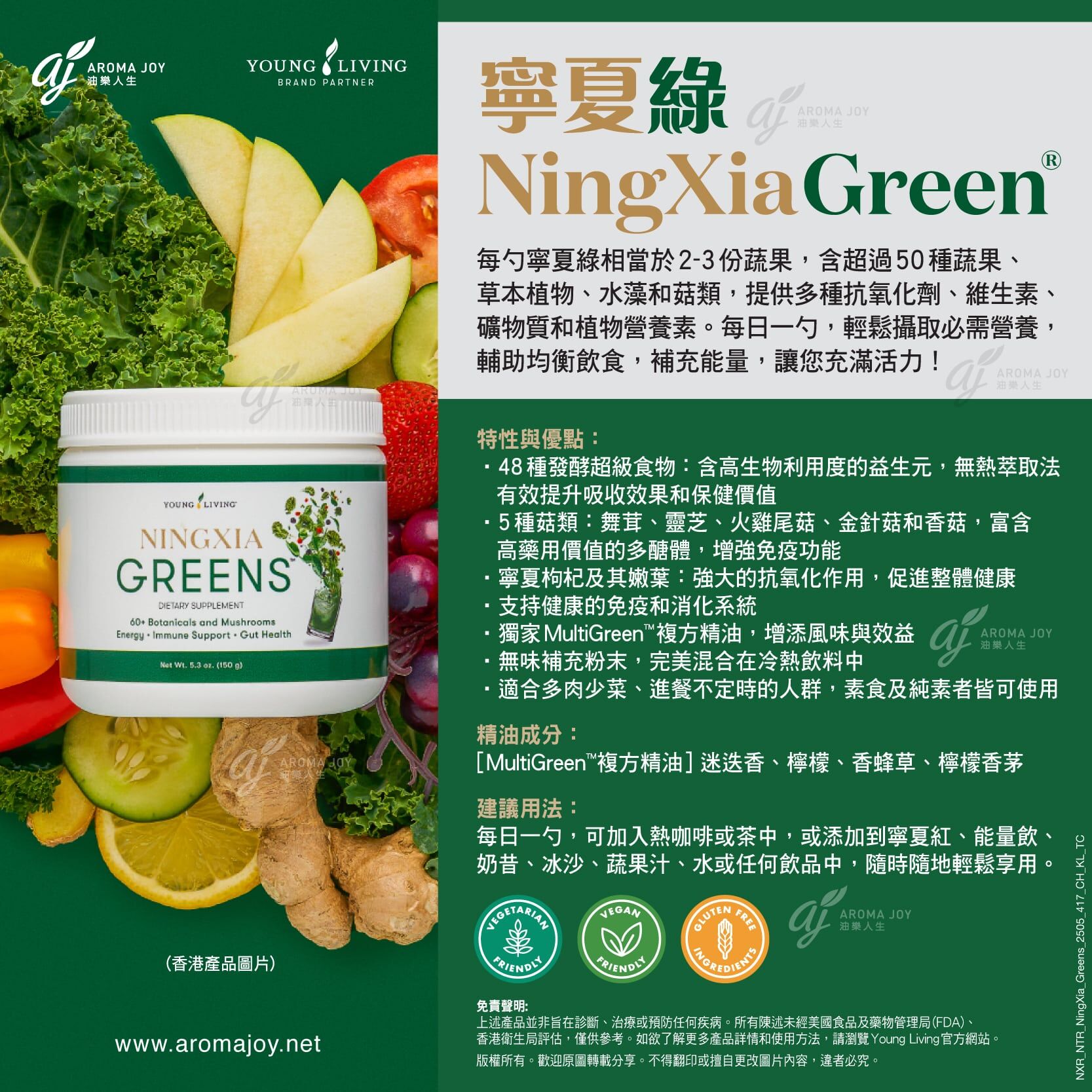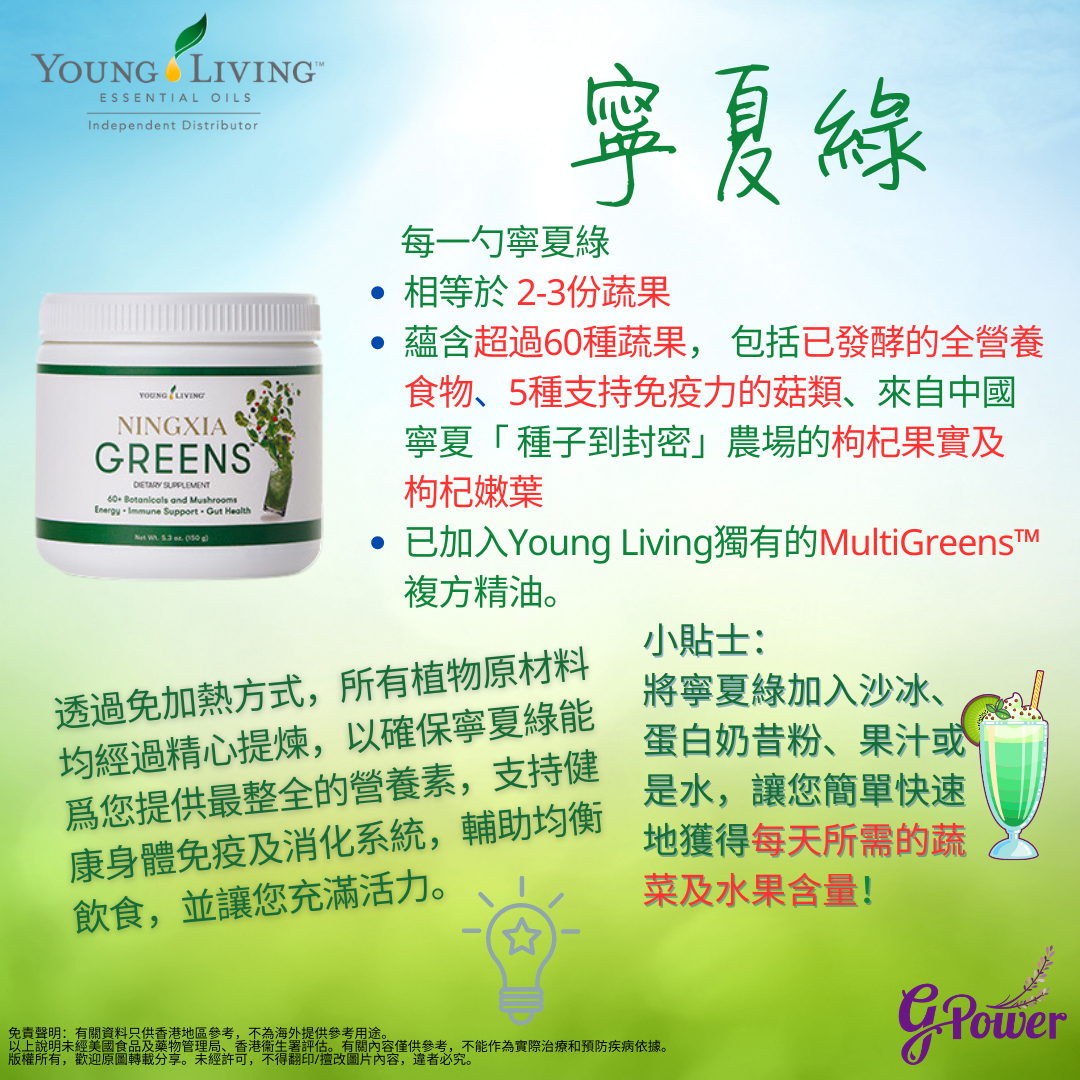 🌱 Young Living 【寧夏綠 NingXia Greens】是一款結合 超級食物 Superfoods、綠色蔬果及精油的每日能量粉 ✨。只需一勺,就能補充多種營養,支持 免疫力 💪、腸道健康 🌿、日常活力 ⚡。方便沖調,口感清爽,是繁忙都市人和家庭的 必備健康飲品 🥤。