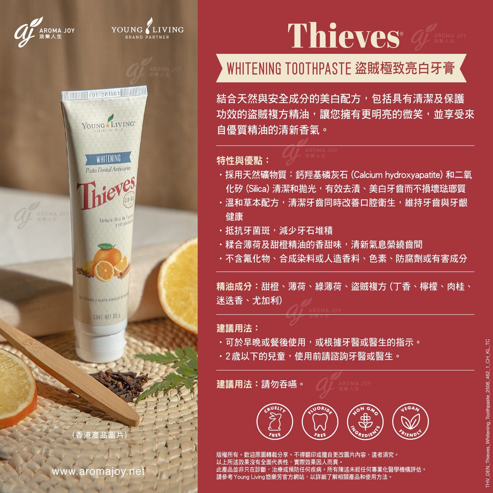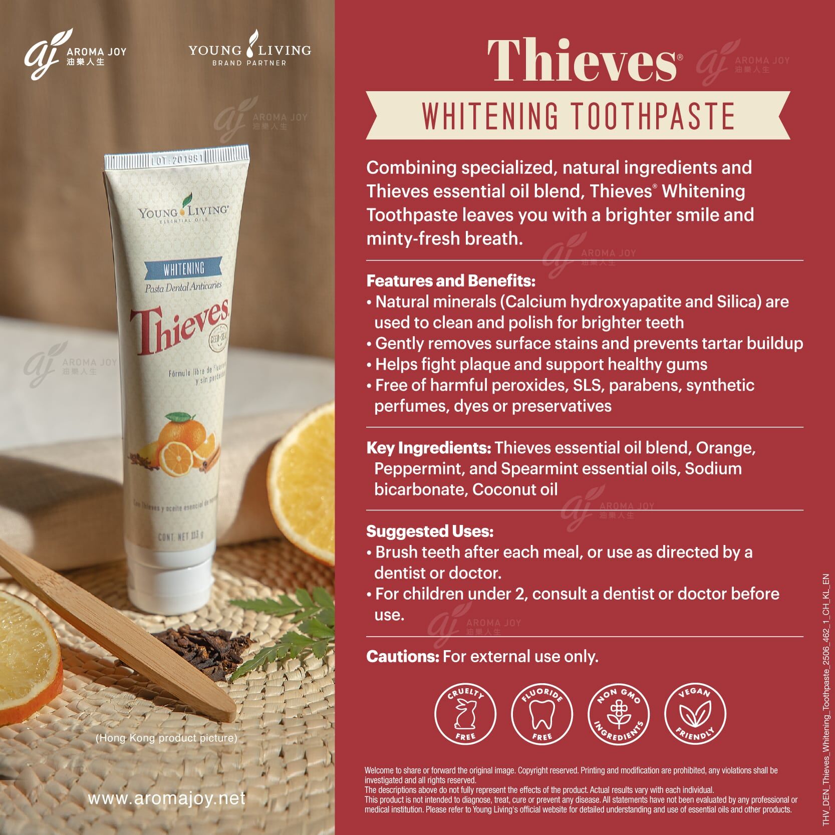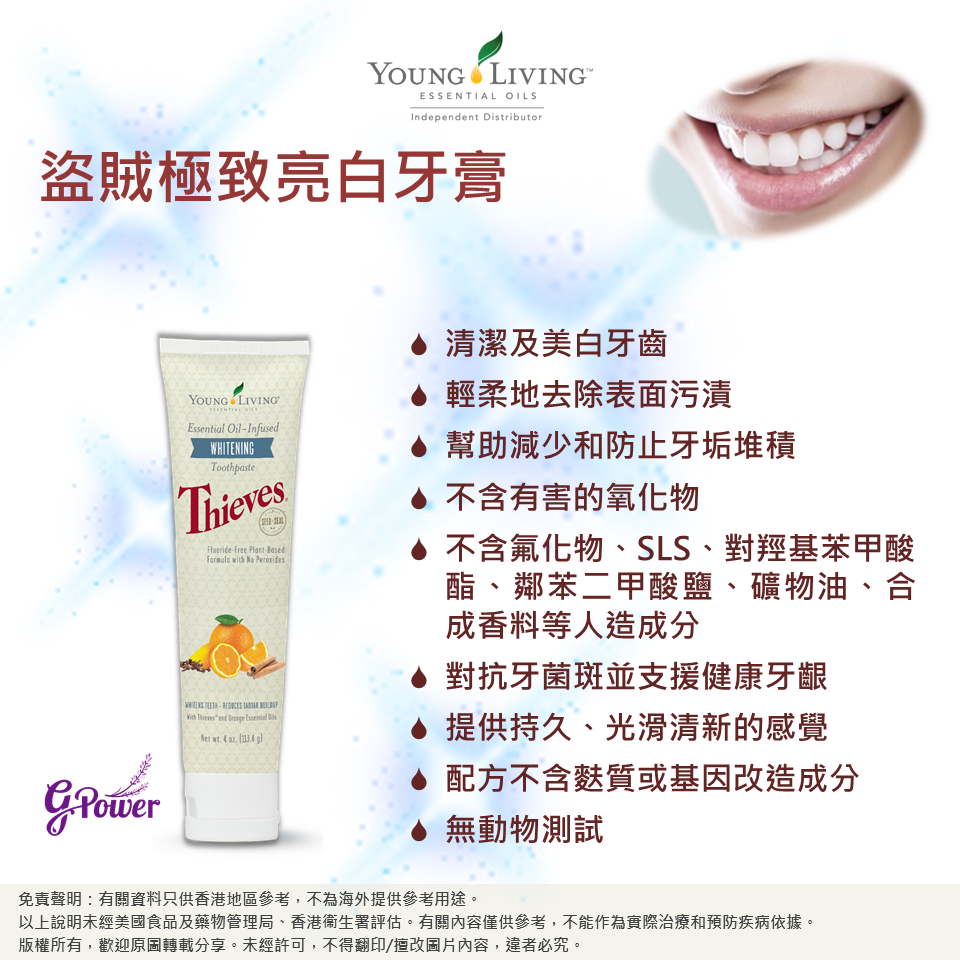 用 Young Living Thieves 天然亮白牙膏,讓笑容自信綻放 🌿✨!蘊含經典 Thieves 複方精油力量 🦷,無氟配方,溫和亮白牙齒,並有效保持清新口氣 🌬️。適合每日使用,守護口腔健康 💚,讓你天天展現亮白笑容 😁。